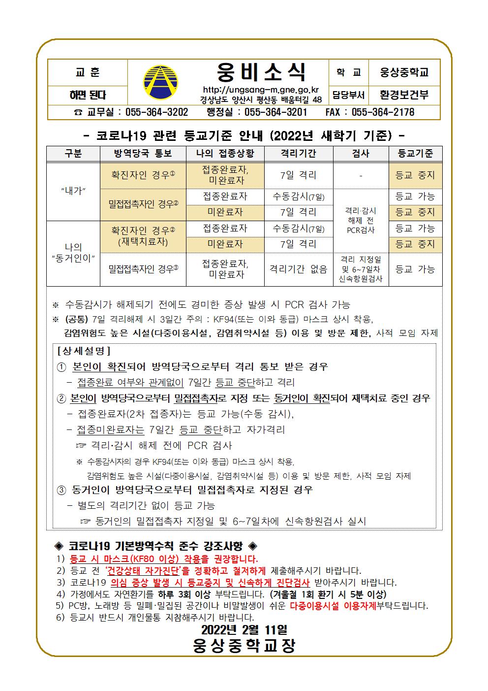 새학기 코로나19 관련 등교기준 안내