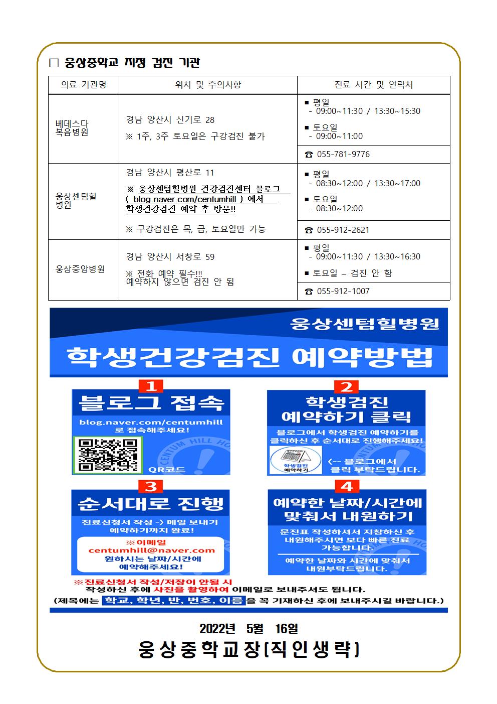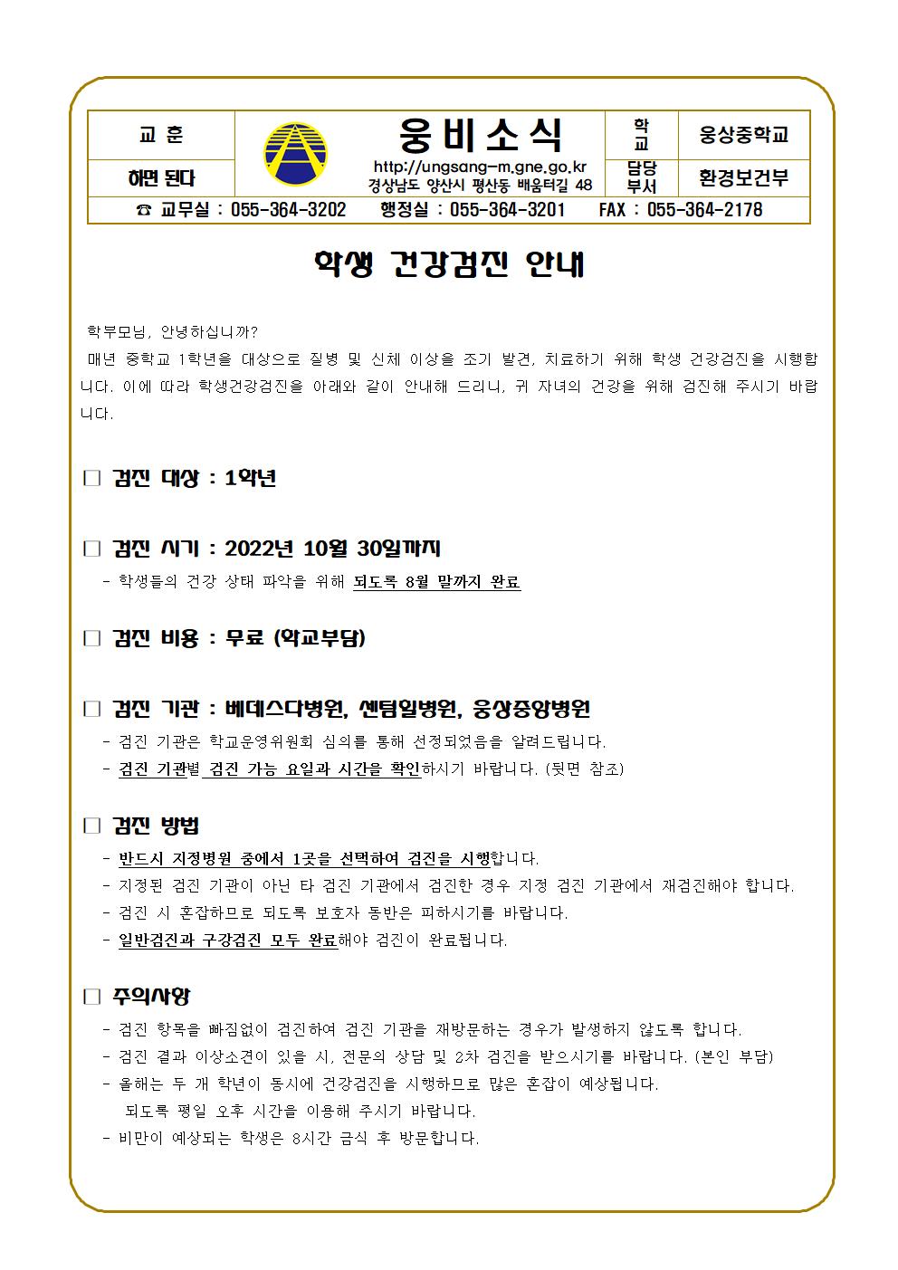 1학년 학생건강검진 안내