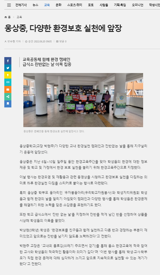 6월 환경교육주간동안 우리 웅상중에서 활동한 내용이 양산신문에 게재되었습니다. 우리학교 학생, 교사,학부모가 함께 참여한 활동이라 더욱 특별했답니다.~~