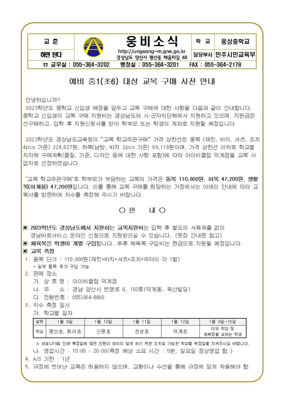 2023학년도 웅상중학교 신입생 교복구매 안내