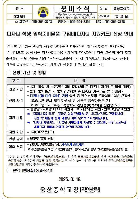 2025학년도 다자녀 학생 입학준비물품 구입비(다자녀 지원카드) 신청 안내