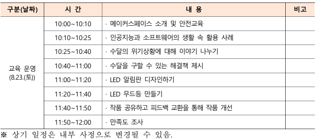 1. 사 업 명: 학교 밖 융합교육 지원 2. 교육일정: 2025. 8. 23.(토), 10:00~12:00 3. 운영장소: 진주교육대학교 전산·실과관 4층 5406호, 5407호 4. 모집인원: 경남 지역 초등학교 3학년 ~ 중학교 3학년 학생 40명 ※ 총 2개 반으로 분반하여 진행 예정 5. 모집기간: 2025. 7. 28.(월) ~ 8. 14.(목) 18:00까지 6. 모집방법: https://forms.gle/EHg4vvyXHjQm26bJA 링크 및 아래 QR코드를 활용한 신청서 선착순 접수  ※ 참여 확정 후 참여자마다 개인정보활용동의서 받을 예정 7. 세부일정