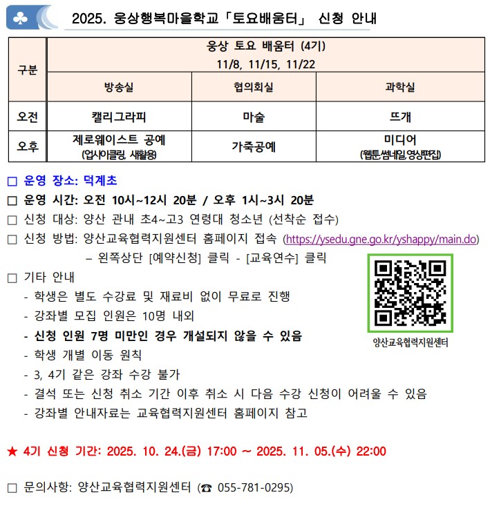 * 신청 방법: 양산교육협력지원센터 홈페이지 접속 (https://ysedu.gne.go.kr/yshappy/main.do)